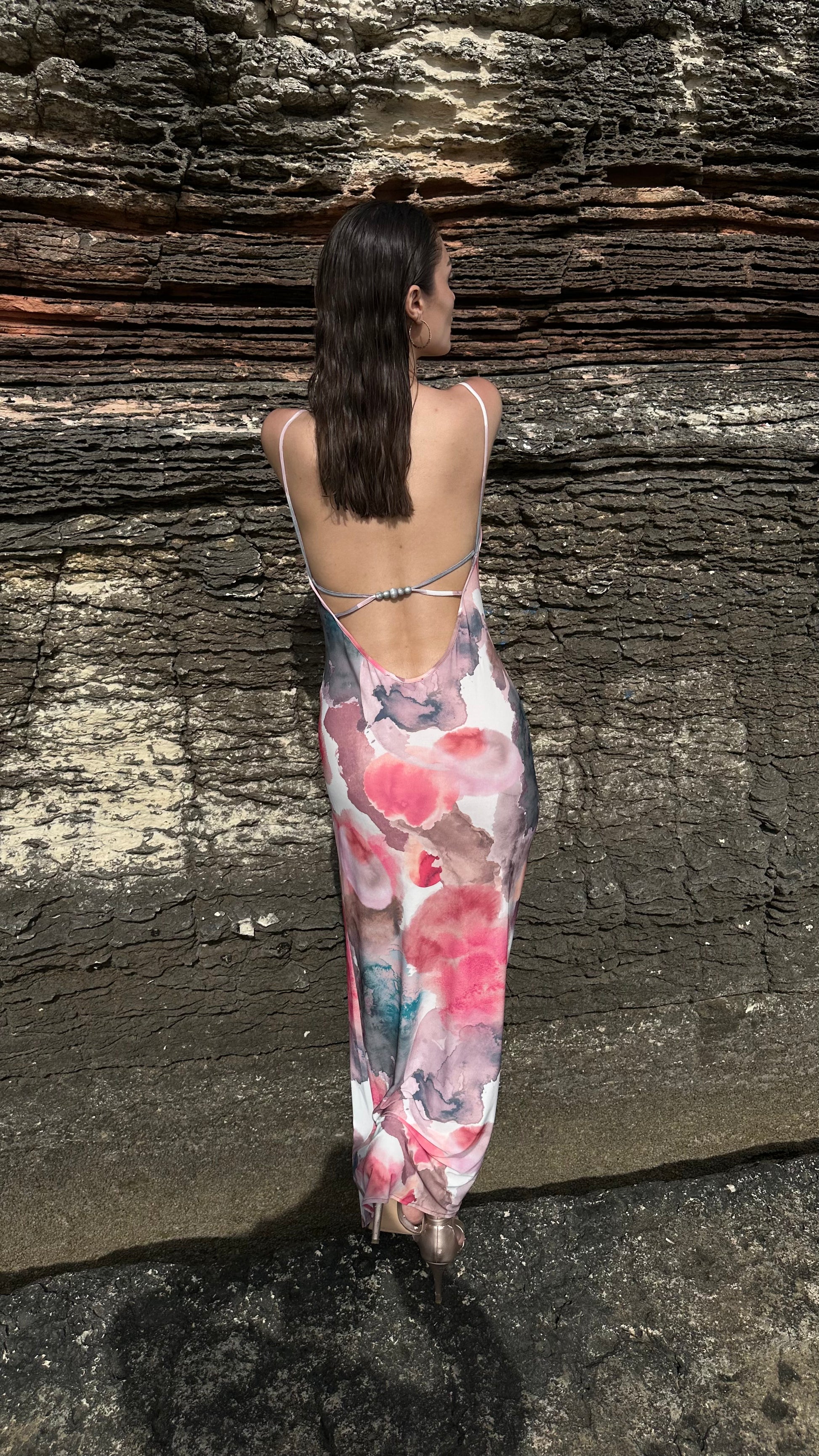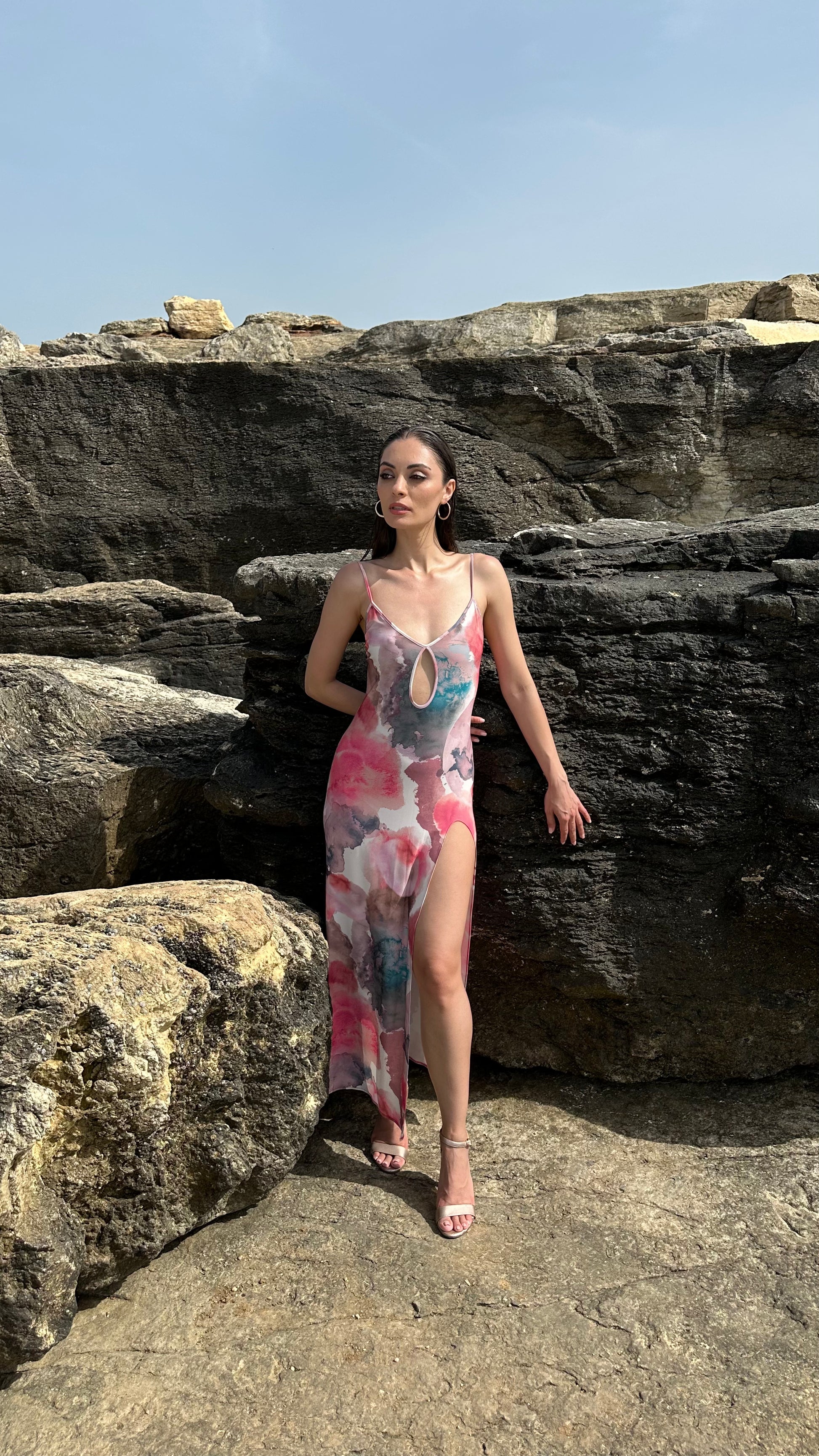 Aquarelle ile suluboya tablosunu andıran bir zarafete bürünün. Pembe, turkuaz, gri ve beyazın yumuşak tonlarıyla desenlenen bu maxi elbise, derin göğüs dekoltesi, boncuk detaylı zikzak iplerle süslenmiş açık sırtı ve cesur bacak yırtmacıyla sahil şıklığını hafif ve özgür bir stille buluşturuyor.