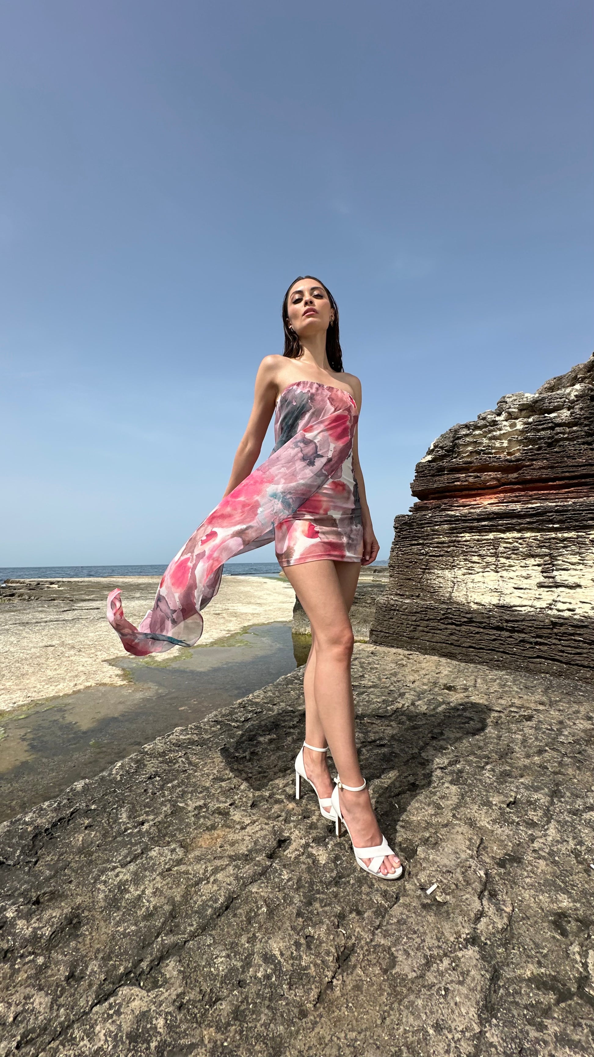 İncecik bir kıyı meltemine karışan sis tülü gibi… Coastal Veil, straplez mini elbisesinin üzerine zarif bir şifon katmanla tamamlanmış bir tasarım. Hafifliğiyle her adımda dalgalanan bu rüya gibi parça, deniz esintisinin zarif dokunuşunu stilinize taşıyor.