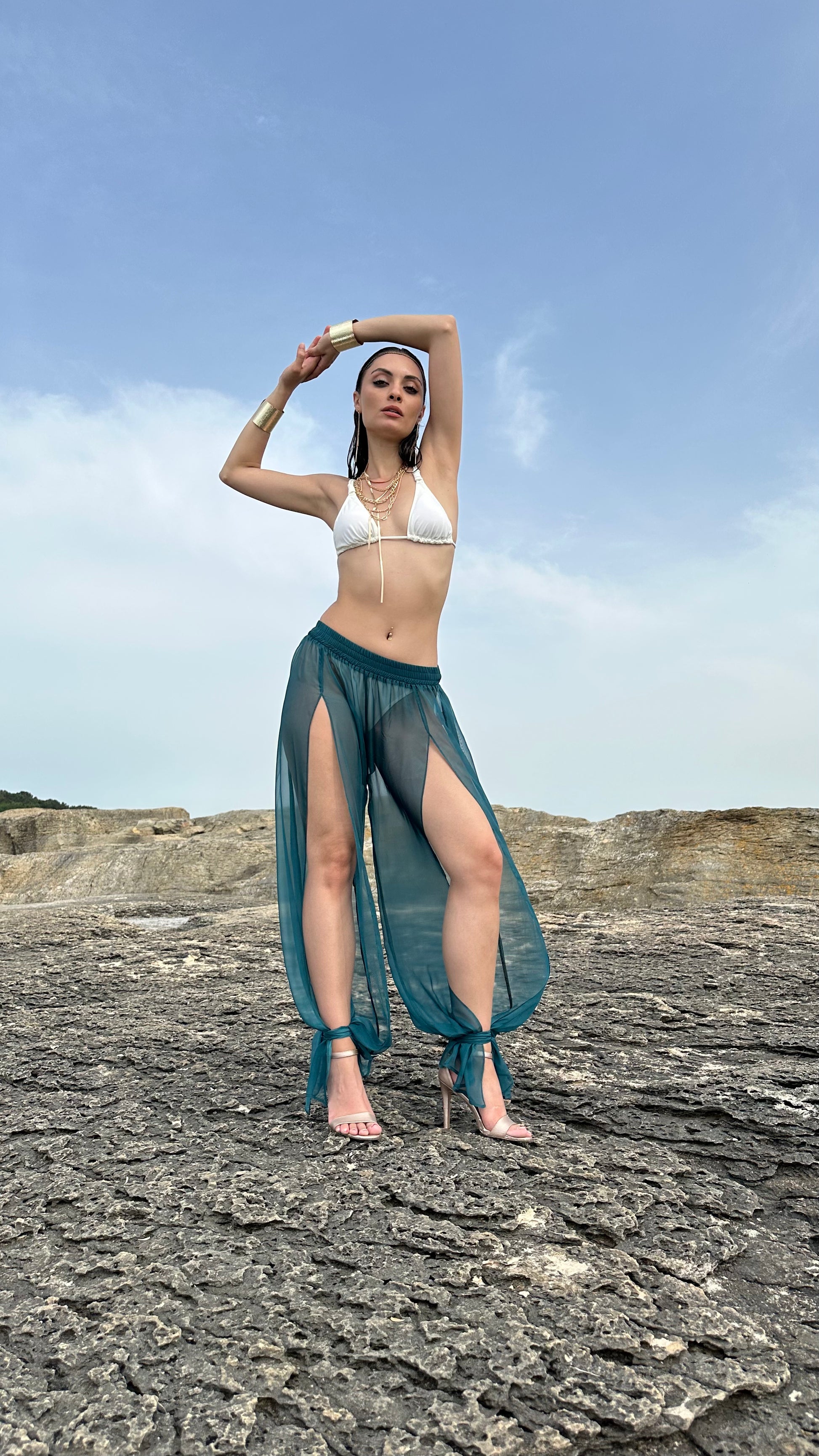 Mistral ile yaz esintisini stilinize taşıyın. Hafif ve dökümlü şifon kumaşı, huzur veren petrol rengiyle buluşuyor. Her iki bacağındaki derin yırtmaçlar ve bilekten bağlanan zarif detaylar hareketinize eşlik ederken, lastikli beli gün boyu konfor sağlıyor. Mistral, sıcak günlerde ve keyifli sahil yürüyüşlerinde her ana rahat ve şık bir dokunuş katıyor.