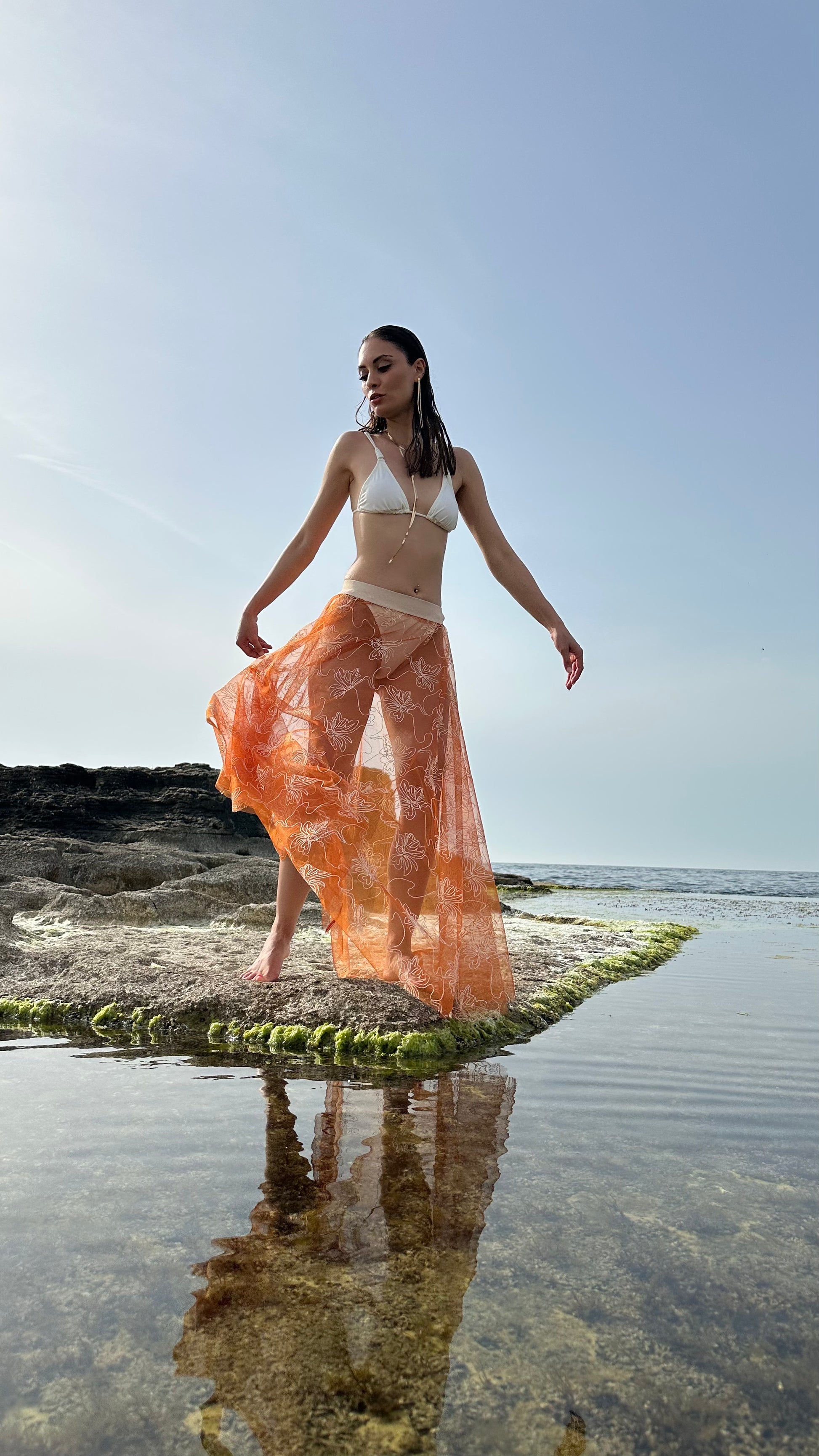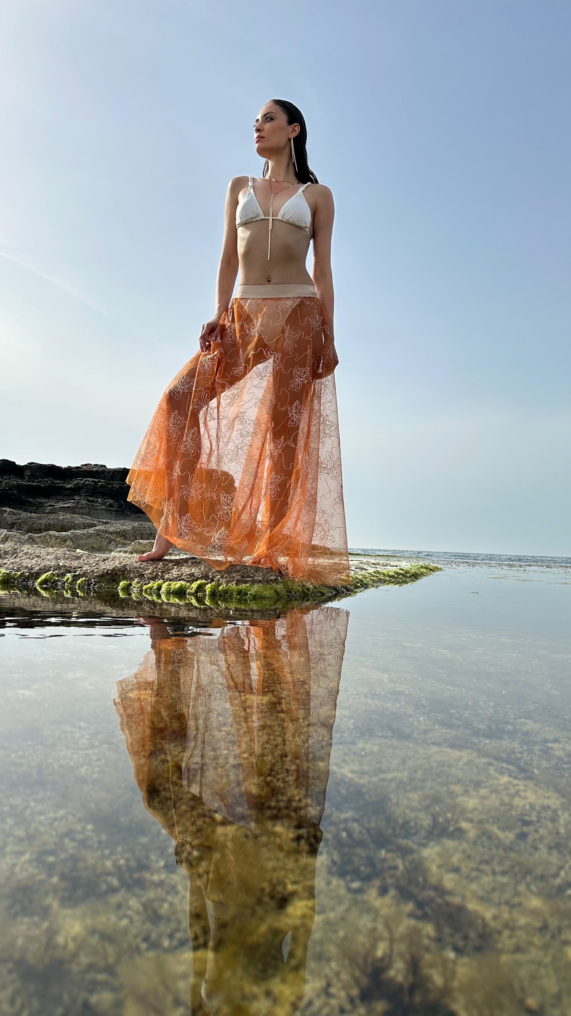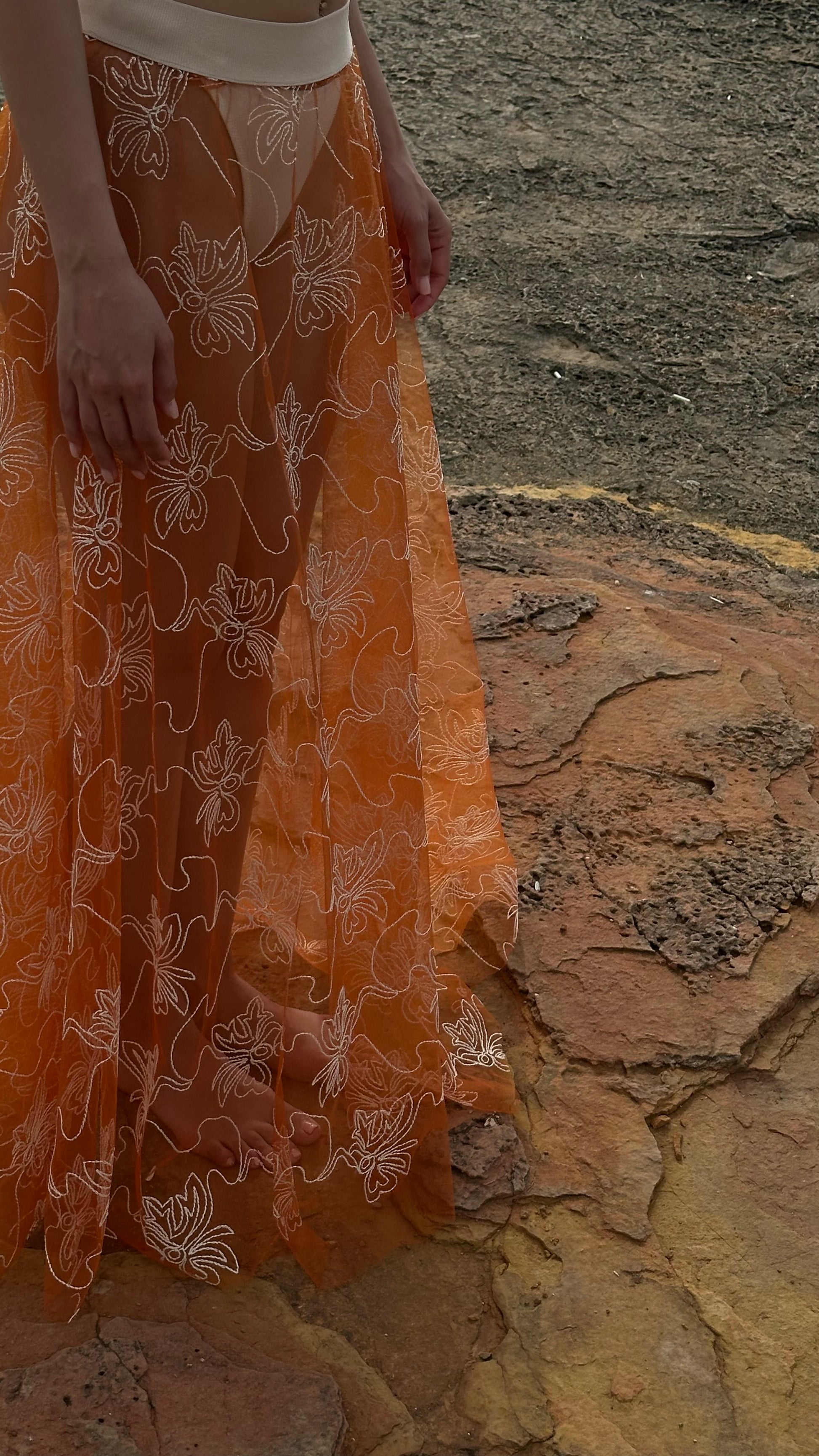 Her adımda zarifçe dalgalanan verev tül etek Sunset Bloom ile gün batımının altın ışığı gibi parıldayın… Krem rengi çiçek işlemeleriyle tamamlanan bu sıcak ve ışıltılı parça, gün batımı hissini gittiğiniz her yere taşıyor.
