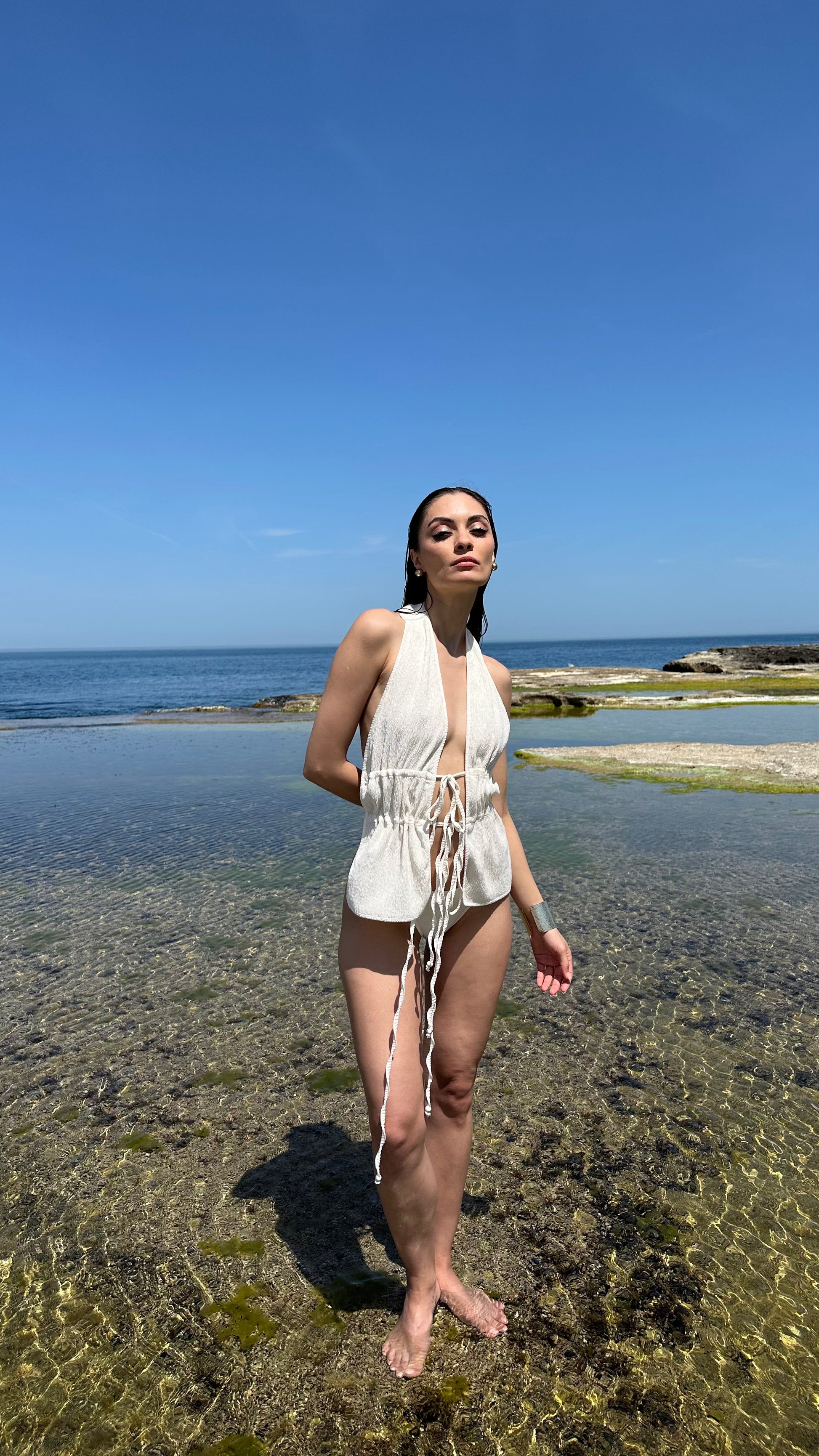 %100 pamuktan üretilen bu sırtı açık bluz, önden zarif iplerle bağlanıyor ve arkadan bakıldığında göz kırpan ince ip detaylarıyla neşeli, çabasız bir siluet yaratıyor. Sahil esintisini yansıtan bu parça, sade bir şıklıkla fark yaratmak isteyenler için ideal.